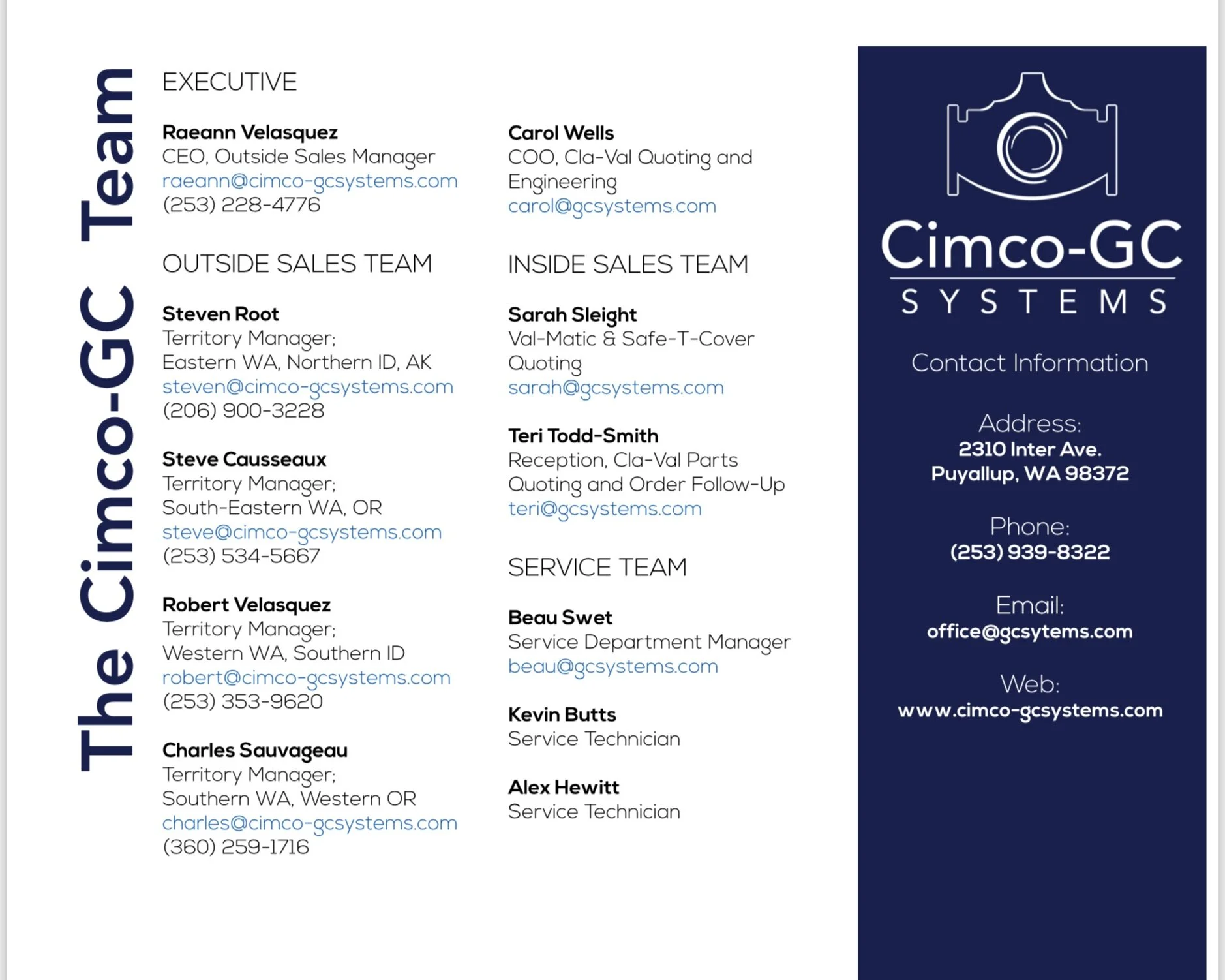 Cimco-GC Systems will be a sister company to Cimco Sales & Marketing, continuing the quality representation and service of Cla-Val in Washington, Oregon, Idaho and Alaska that GC Systems is renowned for.